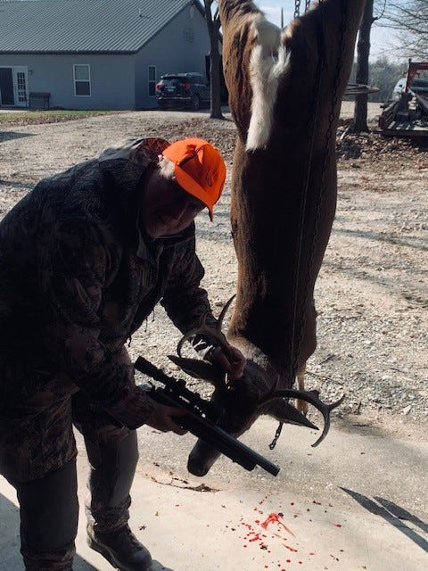 So here we go, That Friday morning I got in the blind an hour and a half before legal shooting time as I am a believer in getting to my blinds early and quietly, it was 15 deg that morning but due to utilizing SITKA layered system I stayed warm. I also use Kenetrek boots for warmth and stability. I also use Wilderness Athlete hydration as I tend to not take in enough water while hunting. So as the beginning of a fantastic sunrise appears I am in awe at what God gives us when we just open our eyes and our minds. As the time goes by, I am ever searching for movement and ready to react. At 9 :00 am I started hearing a few shots in the area, so my anticipation starts to climb. Then at 9:20 off to my right was a group of 5 does bursting out of the trees into the soybean field followed by a spike buck. Then at 9:25 a buck came running out and my brain went straight to work, it Said “old buck shoot!!!!”, without hesitation I took the pistol and moved to the window on the far right and as I leveled up on the buck putting the crosshairs on a high shoulder shot and all in one fluid moment squeezing the trigger the buck collapsed straight down like a sack of taters. Now here is the kicker, when I squeezed and as the buck was collapsing in slow motion my brain then said, “what are you doing, this is not the buck we were wanting?” This was all in a nano second. I sat there and stared at the body in the field, 152 yards away. I never rush a shot, second guess myself until now. I just sat there and looked and thought, why did I do this? After 15 minutes I got up and got out of the blind and slowly walked over to the deer and as stood above him looking down I got down on my knees and I opened his mouth, and his teeth were completely worn into the gums. I look at his face and his antlers and then it made sense to me, all the years of studying management and understanding the taking of the old/ mature animals had ingrained into my subconscious, I realize I did the right thing and I thanked GOD for his gift to me. So now the work begins for phase two, we load the heavy animal into the UTV and carry him back up to a neighbor’s barn to begin the cleaning process. Once he is cleaned and washed down and cut up and place in the coolers with ice, he will then make to the trip back to Texas to have final processing done as everything I hunt is eaten, never wasted. Even the antlers are used either in a mount or turned into something useful.